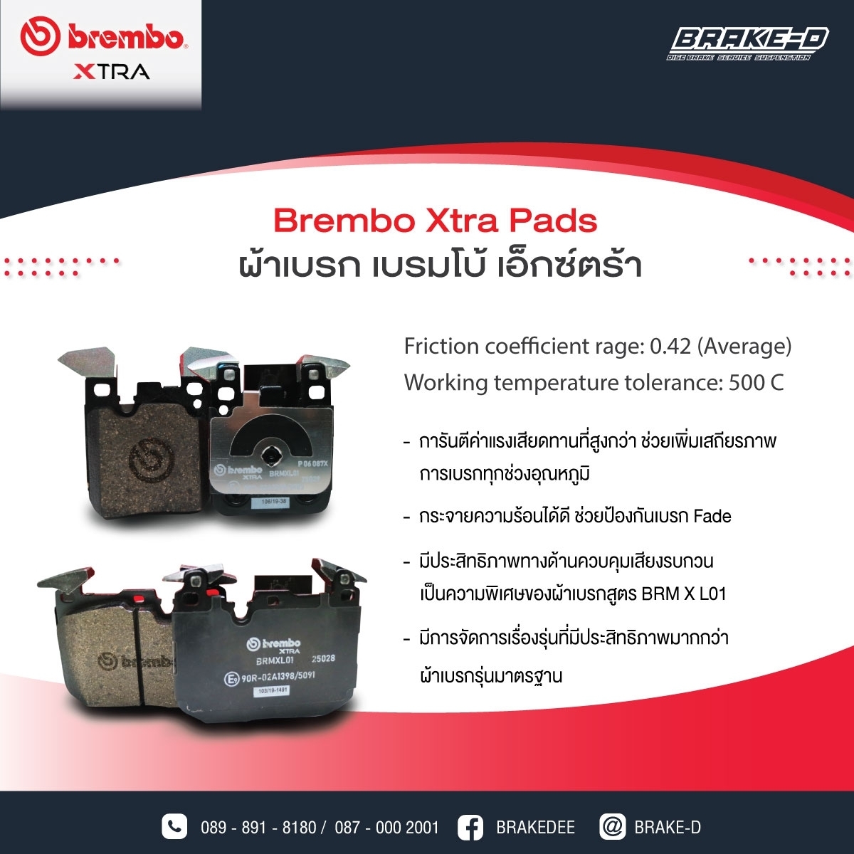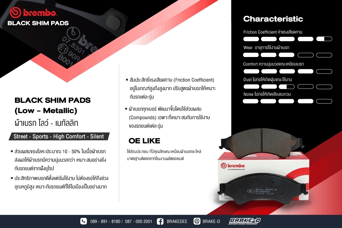 - สัมประสิทธ์แรงเสียดทาน (Friction Coeffcient) อยู่ในเกณฑ์สูงถึงสูงมาก ปรับสูตรผ้าเบรกให้เหมาะกับรถแต่ละรุ่น