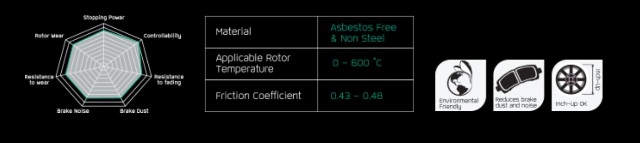 - โดดเด่นด้วยเทคโนโลยี Hollow Structure ที่นำวัสดุวิศวกรรมที่ถูกสร้างขึ้นโดยนวัตกรรมทางเทคโนโลยีเฉพาะ ทางสำหรับยานยนต์ ให้มีความแข็งแรงพร้อมกับ มีโครงสร้างที่เหนือกว่าโครงสร้างผ้าเบรกทั่วไป จึงทำให้มีการ ถ่ายเทความร้อนได้ดี ช่วยให้ประสิทธิภาพ การเบรกเสถียรในทุกช่วงการใช้งานถึงระดับอุณหภูมิที่ 600 องศาเซลเซียส